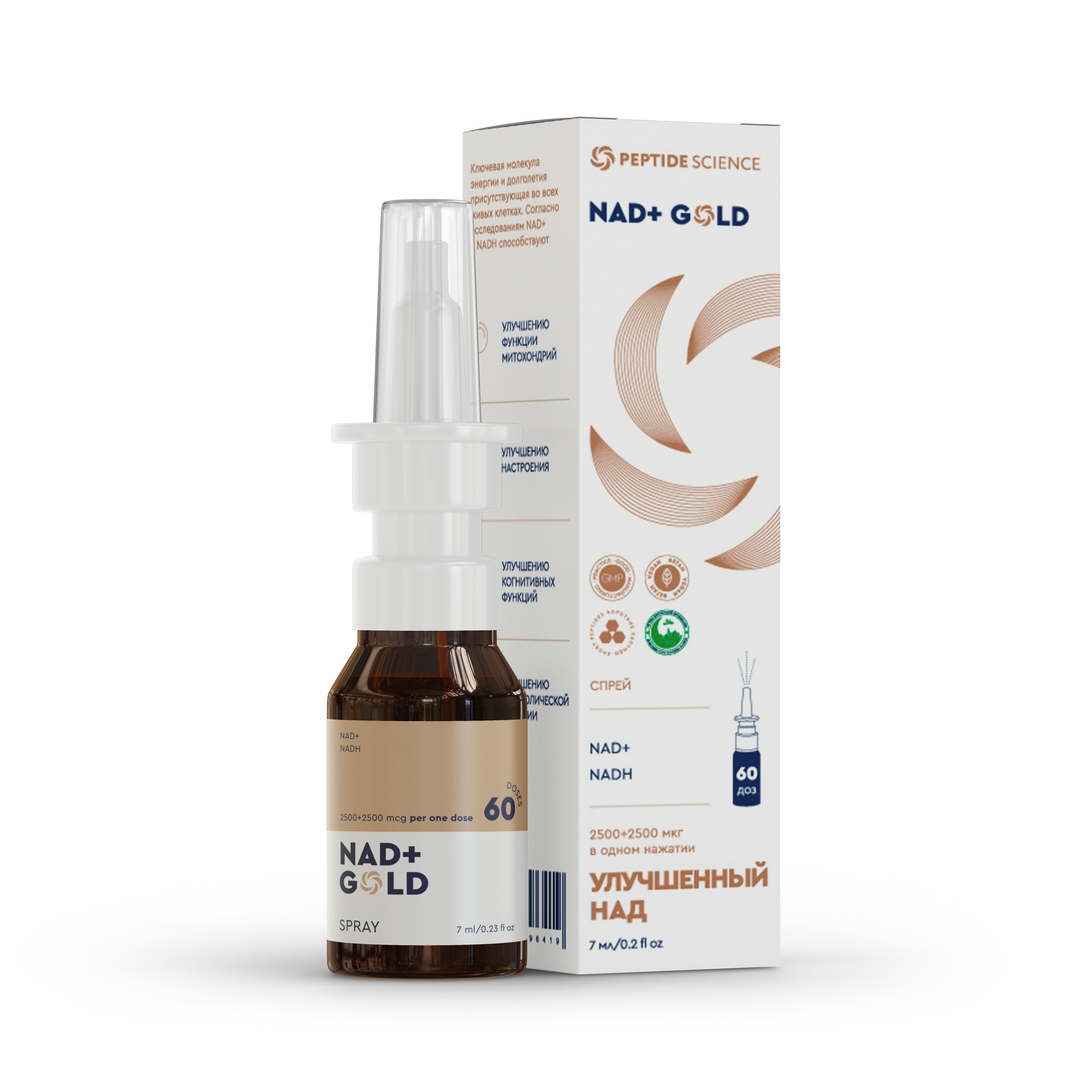 NAD+ GOLD — источник клеточной энергии и антивозрастной защиты в формате спрея. Пептидная формула создана для прямой доставки коферментов NAD+ (никотинамидадениндинуклеотид) и NADH в организм.